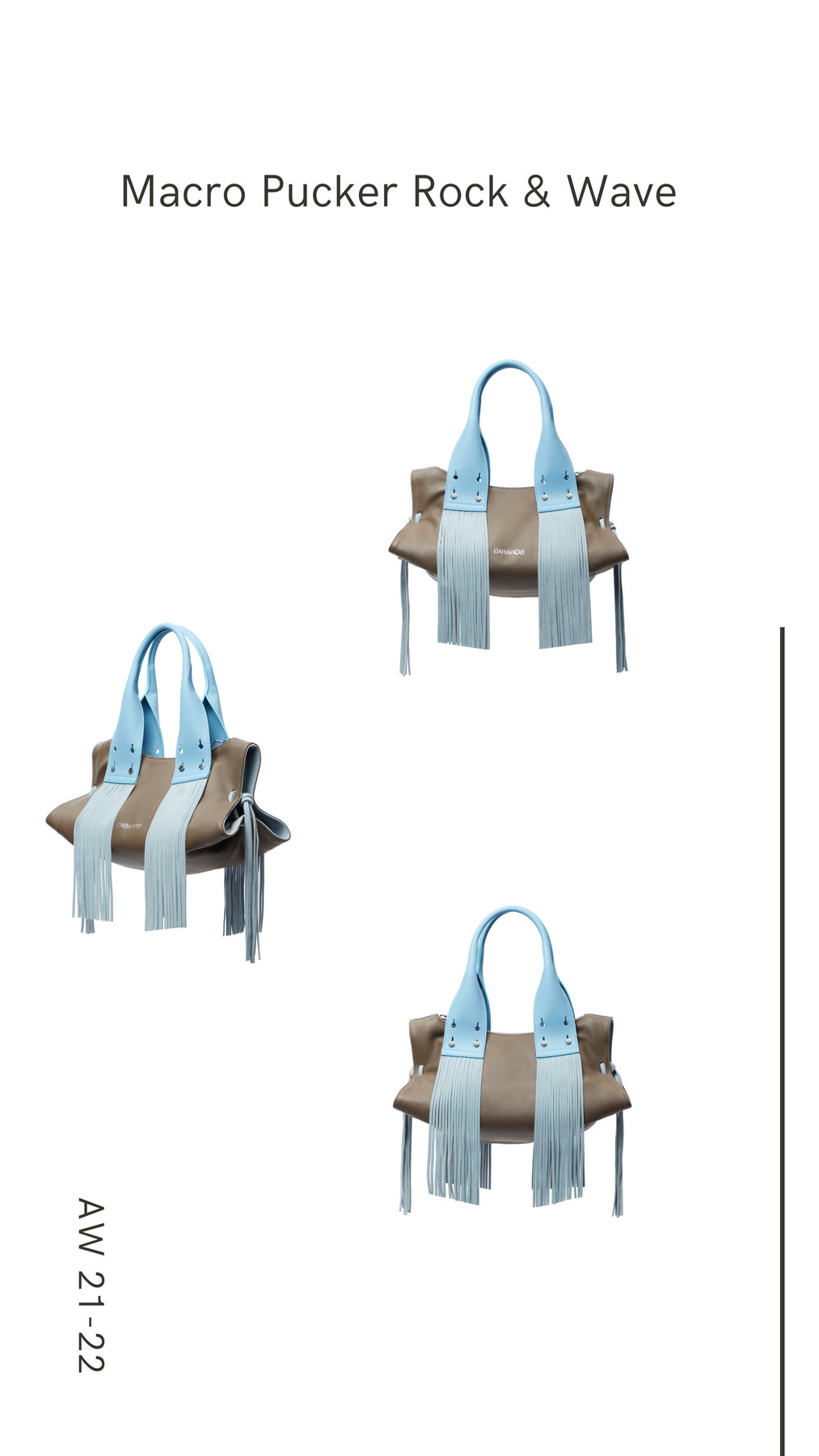 Shirred and tasseled. Elliptic opening shape. Unique sided shape like a piece of art. Pre-modern and oversize handle. Large interior volume. Indispensable for both work life and daily life. Inspired by and in harmony with nature. Colours of earth and sky.